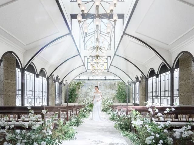 【水と光の感動チャペル体験】天窓の美しいステンドグラスから振り注ぐ柔らかな光が新婦様を包む感動の新チャペル。宗教色がないからこそキリスト教式の他、自由度の高い洋装人前・和装人前式も行っていただけます。