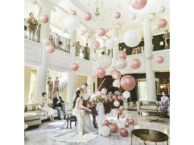 【憧れの結婚式がイメージ出来る♪】ゲストも羨む憧れの”大階段”の入場体験や先輩カップルの映像上映会などの演出をご用意!広大なプール付ガーデンも隣接しているから自然光が差し込む開放的空間。