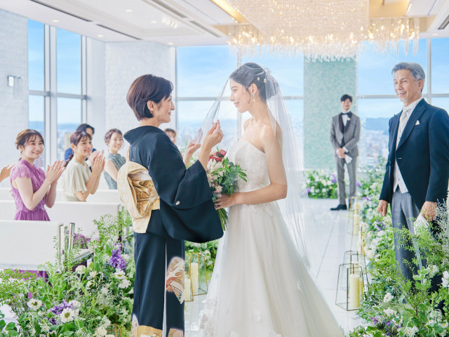 【圧巻の絶景!天空チャペル】地上101mの天空のチャペルでの、挙式入場を体験♪市内を一望できる景観を背景に、お二人の挙式シーンをイメージ♪