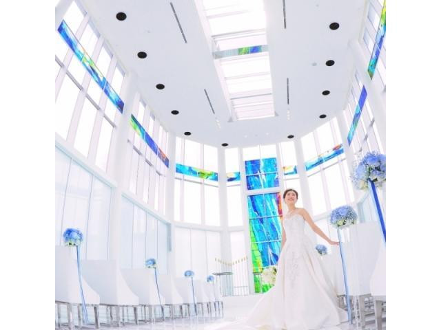 チャペルのステンドグラスはあのサグラダファミリアのステンドグラスも手掛けた、バルセロナの『J.M.BONET工房』による作品。お二人と列席者を包み込む神秘的な光は、祝福に満ちた幸せの輝きです。