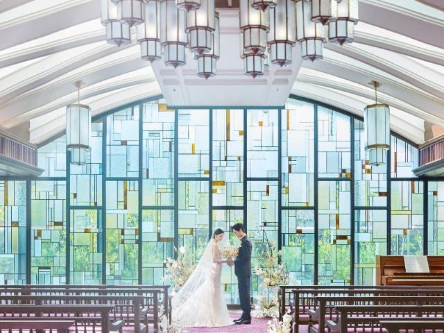 【自然光に包まれる天空チャペル】最上階の独立型チャペルにて荘厳な音色に包まれる感動の挙式入場体験をしていただけます。ステンドグラスや調度品にもこだわった、花嫁が美しく映える空間です。