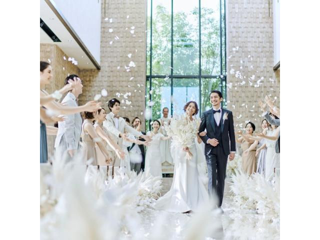 【自然光×眺望が抜群】四面採光の天井高10m大理石チャペルで、自然光に包まれる厳粛な入場シーンを体感。8:45限定の外国人シンガー生歌演出で、ゲスト目線での感動をリアルに味わえます。