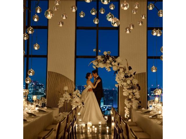【フロア貸切×専用ラウンジ付の贅沢空間】ホテルでは珍しいワンフロア貸切と専用ラウンジを活用し、映像演出やカーテンオープンで華やかに彩る披露宴体験。料理との調和と演出がゲストに感動を呼ぶ空間を満喫して