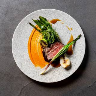 和牛イチボのロースト ライスポットでコンフィした人参ピューレ ローズマリーとレモンのソース