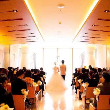 チャペルは、美しく煌めくティファニーのアンティークステンドグラスが輝き、神聖な空気が満ちた空間になっています。キリスト教式では、牧師先生と事前カウンセリングを行いながら、ふたりらしい温かな挙式を実現できます。