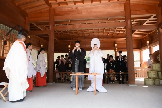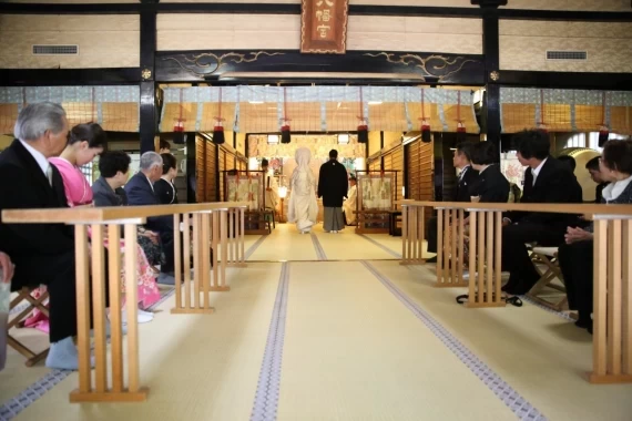「阿佐ヶ谷神明宮」では、駅から徒歩一本の好立地の緑溢れる能楽殿で、伝統的な挙式が行えます。挙式後にゲストとの会食を希望される場合は、境内の中にある会場で行えるので移動の手間もかかりません。
