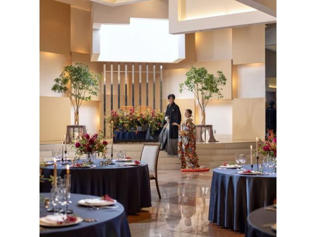 和をイメージさせる格子デザインの現代建築をイメージしたパーティ会場。美空間で叶えるワンランク上の上質ウエディング体験。オリジナル和装人前式や本格神殿での神前式もご提案