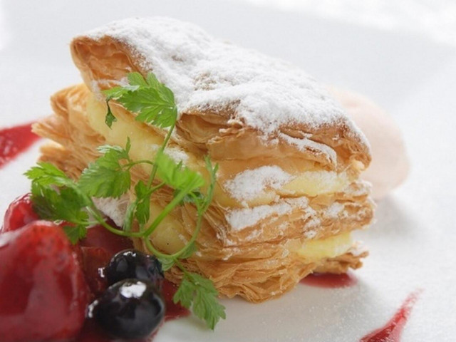 披露宴で一番人気のデザート「ミルフィーユ」は、サクサク感にこだわって絶妙なタイミングで焼きあげます。 ※写真はイメージです。 ※組数限定につき、ご希望の日程でご予約を承れない場合がございます。