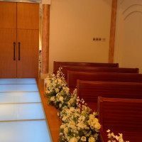 挙式会場は天井に空の模様をあしらった印象的なデザインで素敵でした。ヴァージンロードは青く、天井の空の色とあっており、新郎新婦が空の上を歩いているようで幻想的でした。他にはない珍しいチャペルの雰囲気で思い出に残りました。