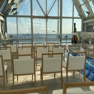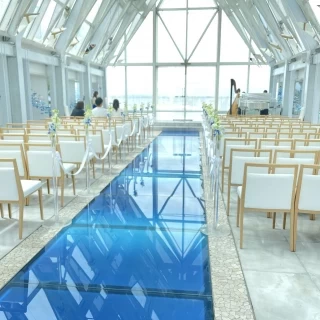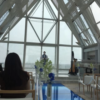 チャペル全体がガラス張りで海がキレイに見えるチャペルです。太陽がキラキラしていて青空、青い海が一望できます。バージンロードも青色の照明で青く輝く道を歩いてとても清々しい場所になっています。扉を開けた瞬間の感動は忘れられません。思わず、わーっと声が出てしまうキレイさになっています。ディズニー好きなら大満足な会場です。ディズニーシーの新エリアのラプンツェルの塔やアナと雪の女王の雪山、ピーターパンの風景、がとても近くて、しかも上から見る事が出来ます。会場は広すぎずアットホームな雰囲気でみんなの顔がはっきり分かるサイズ感になっています。壁や照明も夢の国のような可愛らしい装飾になっていて、風景とマッチしています。舞浜駅から無料のシャトルバスが出ていて、バスで8分ほどの場所にあります。バスに乗っている間もディズニーの景色を見る事が出来るので、ホテル到着までも楽しめる雰囲気になっています。ディズニーリゾートが一望出来る式場と青い空、青い海に囲まれたチャペルがおすすめです。事前にsnsなどで色々調べてそれを参考に準備をするとスムーズに進みます。当日は今までの準備を噛み締めながら、楽しみましょう!詳細を見る (497文字)