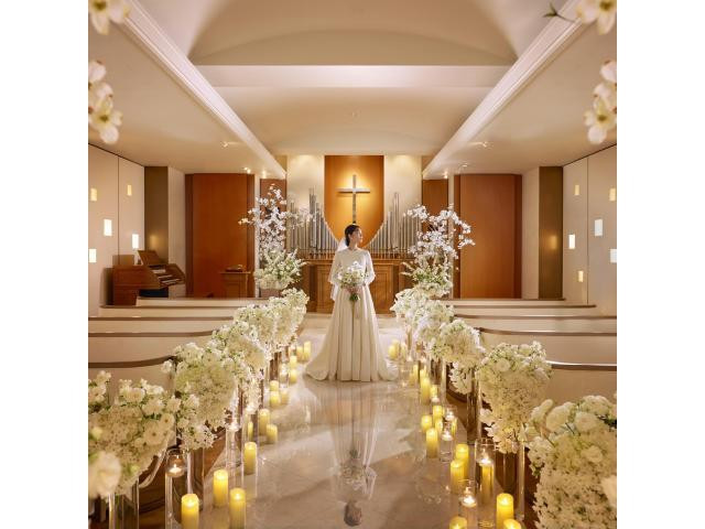 純白のバージンロードや自然光が差し込む空間での入場体験により、当日の雰囲気をイメージしていただけます。