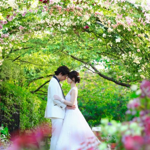 横浜市の花であるバラを基調に様々な花木や草花を散りばめた春の芽吹きから秋の景色まで楽しめる英国式庭園での専用プラン!5 月中旬頃に見ごろを迎える「ローズ・トンネル」での撮影もお勧め!
