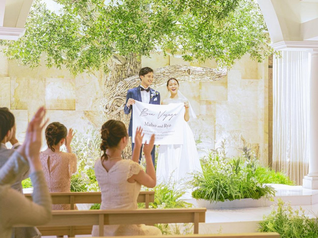 - 模擬挙式- 【木の下で誓う挙式】大きなシンボルツリー≪オリーブの樹≫の下、緑と光に包まれる温かな挙式を体験。全天候型テラスでフラワーシャワーも叶う◎≪今月中のご来館の方限定!挙式料50%OFF≫