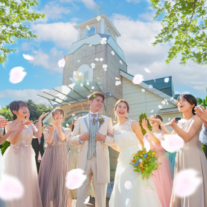 | おすすめ ポイント | 鐘の音が鳴り響く中フラワーシャワーやバルーンリリースなど挙式後はゲストと一緒に和やかな時間をお楽しみいただけます。山手の自然と独立型教会をバックに記念写真もおすすめです。 |