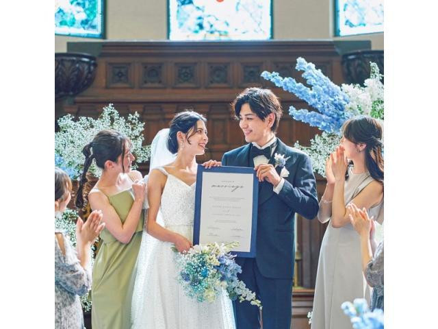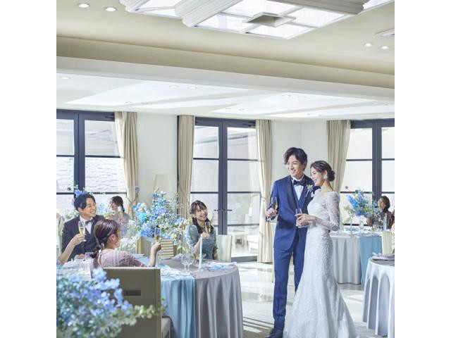 《憧れのロイヤルブルー大聖堂と貸切空間で叶える上質ウエディング》【来館特典】1)1件目来館特典:ギフト券¥5,000、2)A5和牛フィレ肉×出汁茶漬けなど3万円相当のコース試食、3)オリジナルブーケ