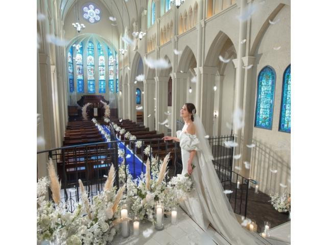 【壮麗な大聖堂での入場体験】大聖堂に輝くブルーのステンドグラスやパイプオルガンの生演奏に包まれ、約20mのヴァージンロードを歩き本番をイメージ♪階段入場でゲストの視線を独り占めしよう!