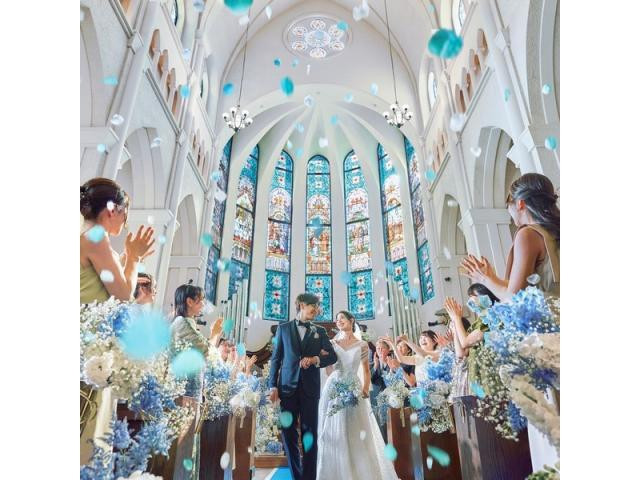【県内唯一ロイヤルブルーのバージンロード×青のステンドグラス】ドレストレーンやベールの刺繍まで綺麗に映えるロイヤルブルーのバージンロードは写真映え◎全国でも珍しい階段から入場する大聖堂は必見!