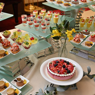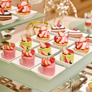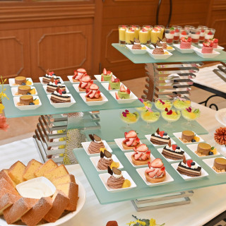 華やかでフォトジェニックなデザートビュッフェも人気のひとつ。色とりどりのスイーツが並ぶテーブルはまるで夢のようで、思わず笑顔がこぼれるひとときに。おふたりのこだわりとパティシエのセンスが融合した甘い世界を、ぜひお楽しみください。