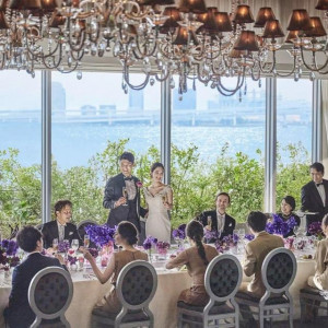 ・チャペルは楕円形で、特徴的な形の白い壁と柔らかい光がマッチしていてとても幻想的です。・ゲスト用の椅子も可愛くで、80人弱を招待して隣との感覚を空けても座り切れるくらい広いです。・ただし、バージンロードの幅はやや狭い印象で、気になる人は気になるかもしれません(私たちはほとんど気になりませんでした)。・曲は生演奏であり、幻想的な雰囲気とマッチして感動的な瞬間を演出してくれます。・この式場に決めた一番の理由がこの披露宴会場です。・会場は円形となっており、海やレインボーブリッジを一望できる開放的なロケーションが特徴的です。窓には白い窓枠が入っており大きな一枚ガラスという感じではないですが、逆にフェミニンで可愛い印象を与えてくれます。・高砂を中心に、バックに海、窓下には可愛らしいソファが用意されておりとにかく開放的で可愛らしい雰囲気です。照明らお花のよう形で、暖かい色味の光が会場にマッチします。・当日の天気は曇りでしたが、カーテンオープンと同時に光が入ってきて歓声が湧きました。・会場の大きさは十分な広さで、大きすぎる印象はないためアットホームな雰囲気を演出できます。・四角形で外と切り離されたスタイリッシュな雰囲気よりも、外の景色を楽しみながら可愛らしくアットホームな雰囲気にしたい方におすすめです。・一つだけ不満点をあげるとすると、会場左右に大きな柱が2本設置されており、入退場時に扉の前に立つ新郎新婦の姿が柱に隠れて見れないゲストがいたことです。新郎新婦が会場中央に歩いてきてようやく姿が見えるので、そこは申し訳なかったです。・よくある全て最低ラインで提示されて安く見せられるということはなく、初期見積もりの段階である程度こちらのこだわりなどを聞いてくれて、カスタマイズして提示してくれます。・料理はアップグレードしたので大きく上がりました。・装花も初期よりも大幅に上がりました。そもそも初期見積もりに載っていた低い金額のプランは提示されなかったように思います。・新婦ドレスと新郎新婦タキシードも大きく上がりました。こちらも初期見積もりの金額で用意できるものはほとんどないと思っていた方がいいです。・ですが上記の3つ(料理・装花・衣装)にお金をかけて正解でした。・ペーパーアイテム類は基本全て持ち込みました。準備は大変ですが、料理・装花・衣装にお金を回すためには惜しまない方がいいです。・ウェディングフェアでの成約で各種特典割引をつけていただきました。・フルールという料理コースと、スーペリアプランという飲み物メニューにしました。・料理は全てが美味しくて、ゲストからも絶賛されました。試食会で一つ上のグレードと食べ比べさせていただきましたが、値段も味もフルールの方がよかった印象です。・飲み物メニューはアルコールは当然のことながら、ノンアルコールカクテルも充実しており、お酒の飲めないゲストにも喜んでもらえました。・jr浜松町駅からは信号に引っかからずに歩いて向かうルートがありますが、知らないと気づくことは難しいです。竹芝駅からはほぼ直結といえるのでありがたいです。・アクセスはいいので、新幹線や飛行機でくる遠方ゲストがいても安心できると思います。・ホテルのある建物から歩いて1,2分の場所にオフィスビルがあり、その中に居酒屋なども多く入っているため2次会などに役立ちます。・ホテルのある建物内に貸切のできるレストランがあり2次会会場として利用しました。東京ベイエリアの海が見える2次会会場は最低保証料金が高いですが、こちらのレストランはかなりお安く大変よかったです。・皆さん丁寧で私たちに寄り添ってくださる方ばかりでした。最初はわからないことだらけでしたが、全ての流れを何度も確認しながら進めていってくださるので、式直前での疑問点はほとんど残らず集中することができました。・当日撮影を担当してくださったカメラマンの方はやや冷たい印象で、ポージングの指示などややわかりづらくそこだけマイナスポイントです。・披露宴会場の雰囲気、会場からの景色は唯一無二と言えると思います。・ドレスの種類も多く、新婦は何度も試着を繰り返して納得のいくものを選べていました。・ゲスト控室が広いラウンジのような部屋だったのも良かったポイントです。・式前日から翌日までの2泊3日をプレゼントいただき、ゆっくりとホテル全体を楽しむことができました。・天気に多少なりとも左右される会場なので、時期は要注意です。詳細を見る (1846文字)