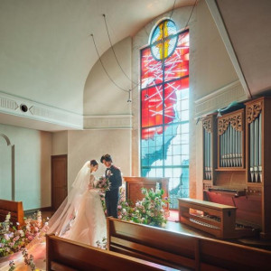 挙式会場に入ってすぐ、ステンドグラスが目に入ってきました。この日はあいにくの曇り空だったのですが、はっきりと濃い赤色のガラスがとても綺麗で印象的でした。後に、実際に式を挙げられた方々のアルバムなどを見せて頂き、良く晴れた日のステンドグラスも、淡く、キラキラと光り、実際に見てみたいと思うほどでした。挙式会場自体は、天井が高く、大理石の床、白い壁、木目調の椅子などが置かれており、まとまり、暖かみのある優しい雰囲気や色合いです。その中にパイプオルガンが置かれており、実際にパイプオルガンでの生演奏をお願いする事もできるとのことで、この挙式会場の強みの1つだと感じました。披露宴会場は綺麗で清潔感がありました。色合いも洗練された感じです。周りは緑に囲まれ、何も無いため、式に集中し、楽しめる環境だと思います。チャペルのみペット可のため、ペットリングが可能です。事前に色々調べておく事が大切だと思いました。詳細を見る (400文字)