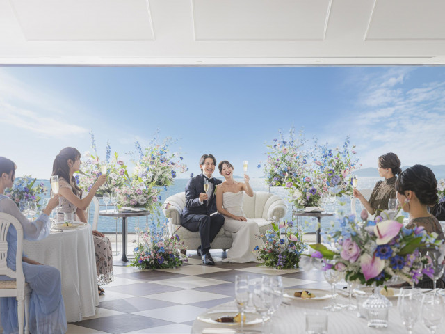 【多様なスタイルを楽しめる4つの会場】270度パノラマビュー!広がる湖×青空の絶景を望む開放感を直接体感*時間の移ろいと共に変わるロケーションはゲストの記憶に残る美しさ。シャンデリア輝く上質空間も人気