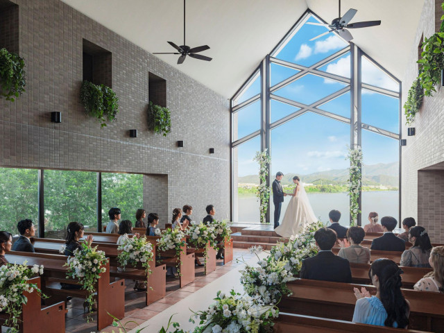 【地上12m*琵琶湖を一望できる絶景チャペル】生演奏が響き渡る天井高9m&バージンロード12m、空×湖×自然光が降り注ぐ開放感溢れるチャペルで入場体験!純白のドレスとも相性抜群<選べる4つの挙式会場>