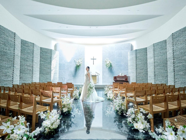 【入場体験】緑豊かな庭園に佇む石造りの独立型教会「セルリアンタワーチャーチ」専任牧師が一組ごとに心を寄せる特別な誓いは本物の教会だからこそ叶う。大理石のバージンロードに映り込む美しいドレス姿も必見