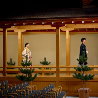 渋谷・桜丘の氏神「金王八幡宮」さまをお祀りしたモダンスタイルの神殿は、和の正装が美しく映えるシックな色調でまとめられ、晴れの門出を迎えるにふさわしい落ち着きを感じさせます。笙(しょう)や篳篥(ひちりき)による雅楽の音色に、凛とした空気。日本ならではの厳粛なセレモニーは、いつまでもおふたりとご両家の心に深く刻まれることでしょう。