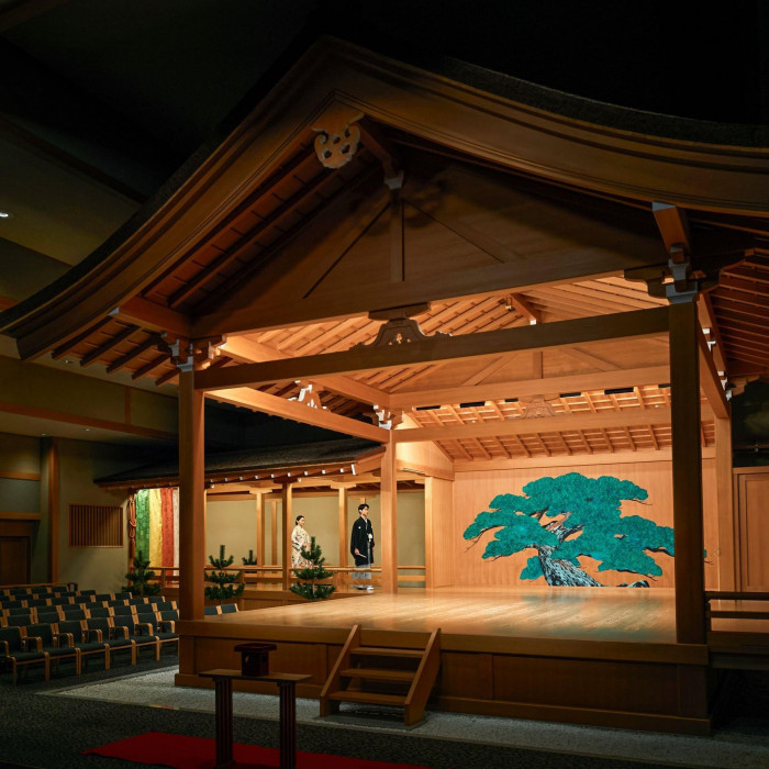 日本の伝統・文化を重んじ、情報発信の地として建てられた「セルリアンタワー」。そのコンセプトの象徴がホテル地下2階に位置する「セルリアンタワー能楽堂」常日頃より、能楽や狂言の公演など、日本古来の文化発信の場として親しまれています。花道ともいうべき橋掛かりを新郎新婦の順に進まれた後、檜の薫り高い神聖な舞台の上で、おふたりの思いを詞に代えて愛を誓います。