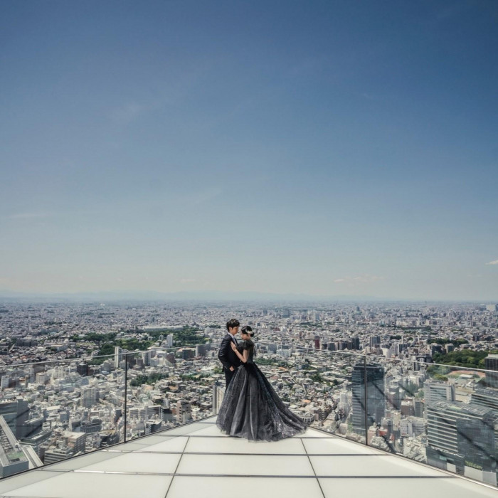 渋谷駅直上の大規模複合施設「渋谷スクランブルスクエア」。その最上階に位置し、日本最大級の屋上展望空間「SHIBUYA SKY」で前撮りが叶う*東急グループのセルリアンだけが独占して撮影ができる特別な場所。※セルリアンタワー東急ホテルで挙式・披露宴お申込みの方限定