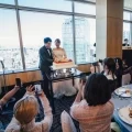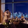 冬の澄んだ青空が広がる、絶景ウエディング。地上145mの眺望は息をのむ美しさ。夜には街の灯が宝石のように煌めき、非日常を演出してくれる。ホテルの絶品フルコースを食べながら贅沢な時間を過ごして。
