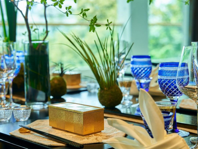 【食のこだわりを引き立たせる食器】お料理は大切なゲストの皆様に感謝の気持ちを伝えることのできるおもてなし。祝宴にふさわしい逸品は備前焼や唐津焼など厳選した器と料理が調和し、目でも愉しめるおもてなしに。