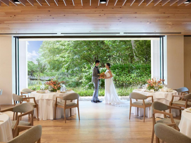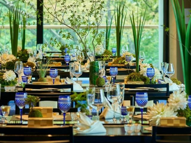 - 模擬披露宴- 【四季折々の豊かな自然溢れる庭園の景色】コンセプトや広さが異なる3つの会場。それぞれが庭園に面し、大きな窓やテラスから臨む景色に心癒されます。会場の雰囲気を体感いただくことでイメージが一層膨らむはず
