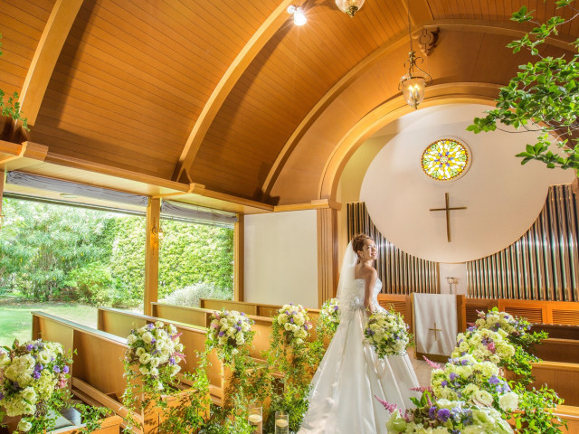 おすすめ ポイント | 壁一面の窓から差し込む陽光の明るさ、静かなガーデンの中に佇む木のぬくもりに包まれたチャペル。チャペルサイドには真っ白なお花の咲く清楚な空間での結婚式が叶う。 |