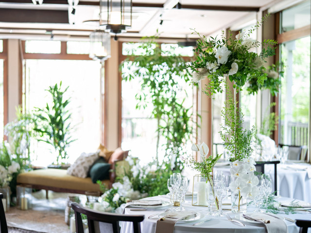 二次会利用 | 利用可能装花もそのまま使えて移動の手間も無し!披露宴では自然光と緑に囲まれてのお食事を、二次会では雰囲気たっぷりにライトアップされた夜のお庭を眺めながらのナイトウエディングをお楽しみに頂けます。 |