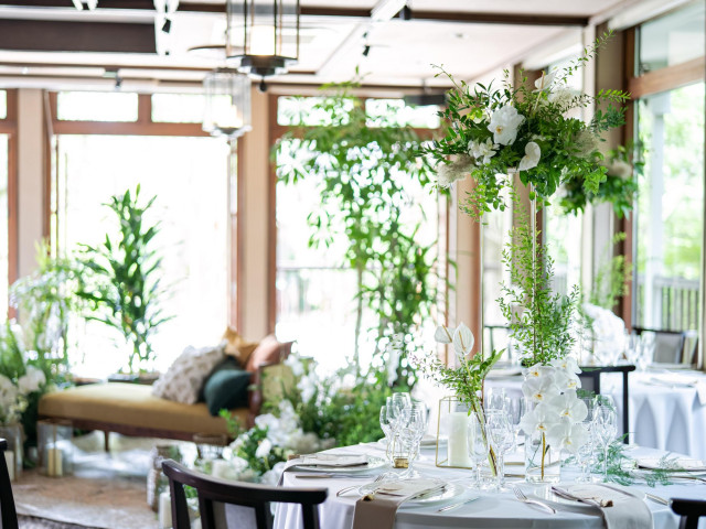 | 二次会利用 | 利用可能装花もそのまま使えて移動の手間も無し!披露宴では自然光と緑に囲まれてのお食事を、二次会では雰囲気たっぷりにライトアップされた夜のお庭を眺めながらのナイトウエディングをお楽しみに頂けます。 |