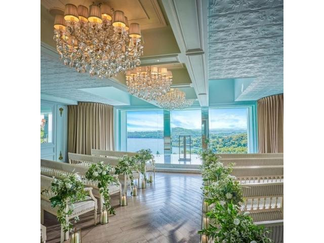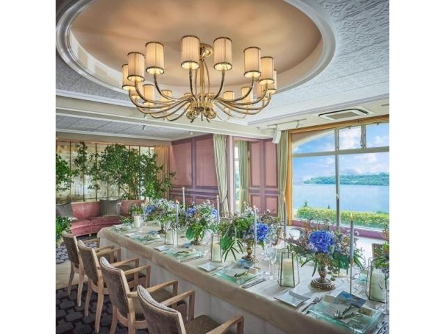 【開放感あふれるパーティ会場は3フロア】気品漂うシャンデリアと自然光溢れる会場の先に空と湖が絵画のような窓の風景がお出迎えします。大切なゲストのための充実した設備もご確認ください。