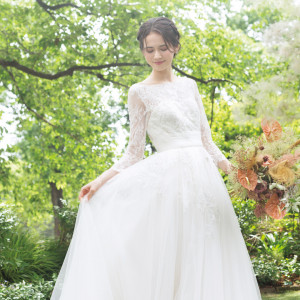 デコルテをレースで覆ったスリーブ付きタイプ。可愛らしさと上品さが両立するスタイルです。