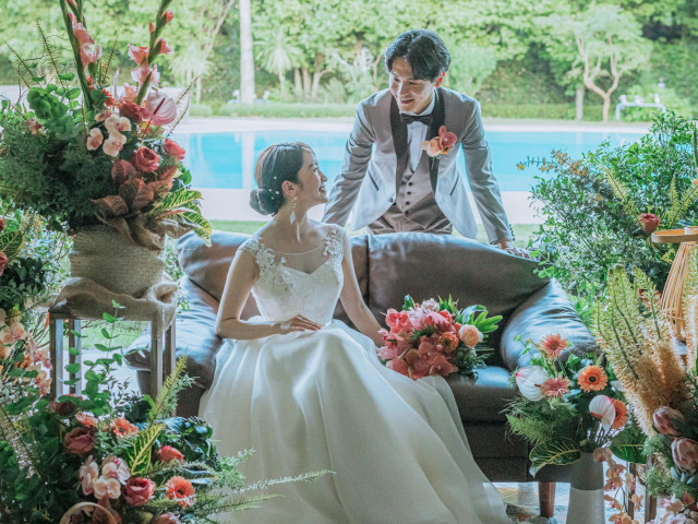 リゾート感溢れる貸切邸宅《シェルハウス》の魅力を体感して。1,300坪もの広大な専用ガーデンでの演出やプールサイドでのデザートビュッフェなど海外リゾートのようなパーティができる空間をご覧ください