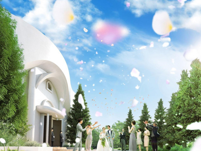 【待望のリニューアル完成】天井高17M!千葉最大級のスケールを誇る独立型チャペルは圧巻!花嫁の憧れ*光と緑に包まれた非日常空間で感動挙式を体験できる。開放感抜群の青空の下、笑顔溢れるアフターセレモニーも。