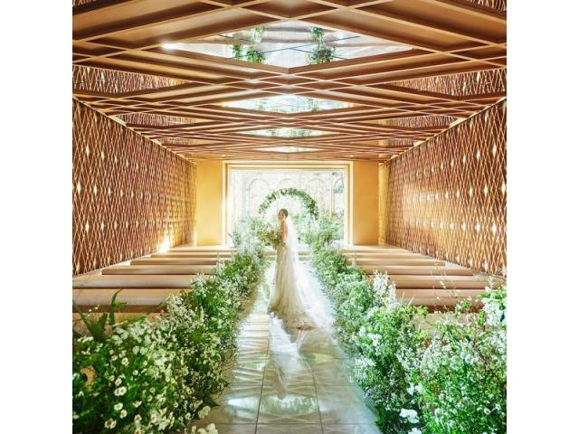 【選べる2つの挙式スペース】美しい20万粒のスワロフスキーが煌めくクリスタルチャペルと、自然を感じる檜の香り漂う和モダンな挙式空間からお好みに合わせてお選びください。華やかなアフターセレモニーも人気。