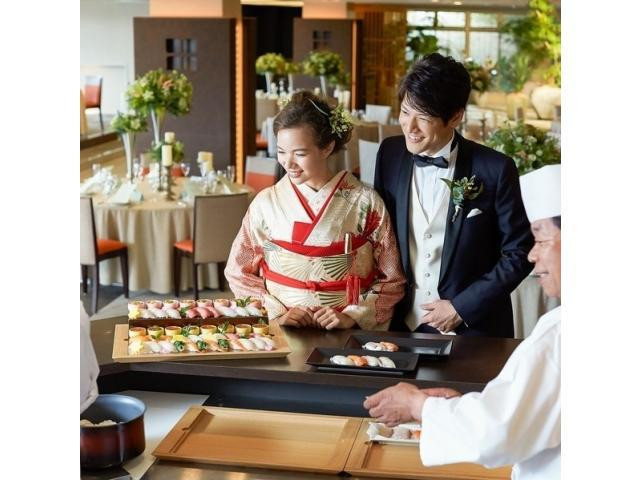 【モダンスタイリッシュな空間を大公開】和装も洋装も映える洗練されたパーティ会場。本番さながらにゲスト目線で楽しめるオリジナル体験盛りだくさん!寿司バーやライブ天ぷら等、和の趣が感じられる演出もご案内!