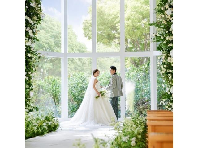 【リニューアル】光に包まれる温かなFLOWERチャペル入場を体感。花と緑に囲まれ、自然の光が二人を包む上質なチャペルで、実際の入場シーンを再現。