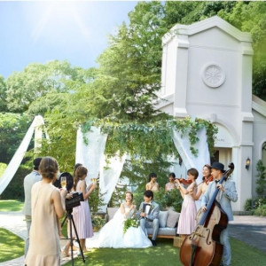 | ガーデン演出 | 有り森に囲まれたプライベートガーデンでは感動のアフターセレモニーを。最上階の会場はプライベートテラス付 |