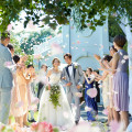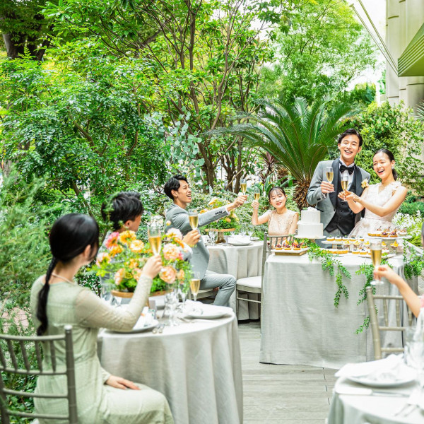 | ガーデン演出 | 有り森に囲まれたプライベートガーデンでは感動のアフターセレモニーを。最上階の会場はプライベートテラス付 |