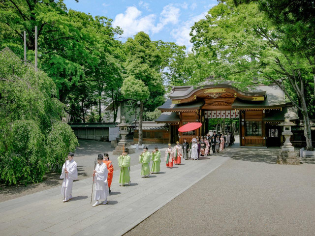 | おすすめ ポイント | 挙式を行う拝殿までの「参進の儀」は、広大な境内の参道を金棒・神官・伶人3名・舞姫2名に導かれ、朱傘をさされた白無垢姿の花嫁の行列は絵巻物の様な美しさで、その場に居合わせた参拝客も見とれてしまうほど。 |