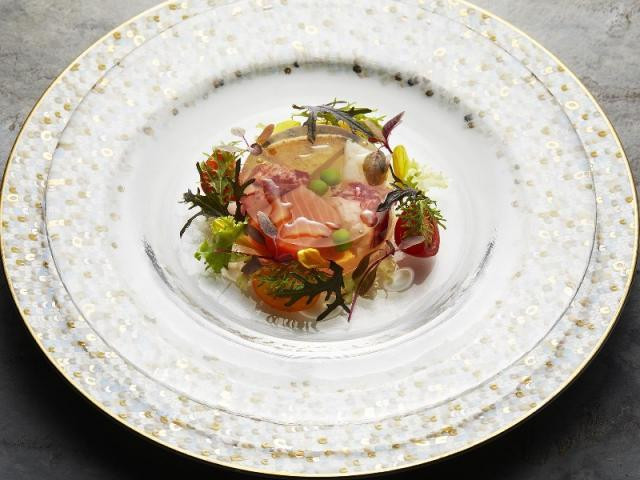 豪華ミクニ試食ご提供!1.アワビと帆立の旨味ジュレ寄せ2.黒毛和牛フィレ肉のメインディッシュ3.キャラメルムースのデセール、至高のひと時を堪能して。