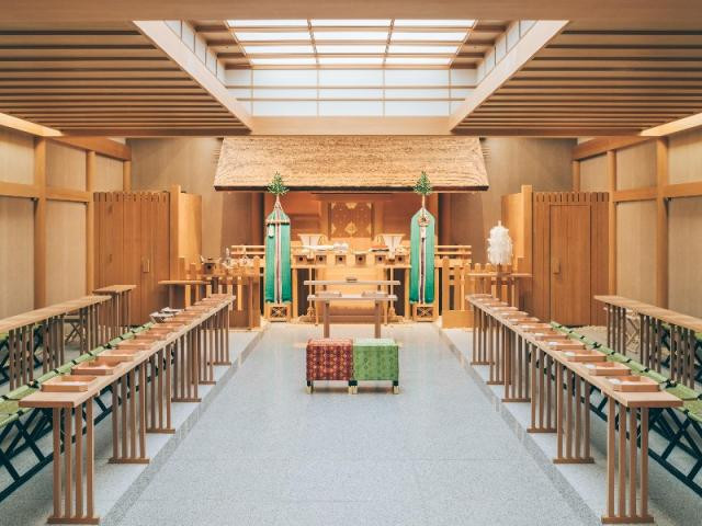【本格神前式がホテルで叶う安心】厳粛なたたずまいを持つ当館の神殿は、由緒正しい熱田神宮の御神符を奉納した挙式場。式中は笙の演奏がふたりの門出を見守り、澄和の伝統を受け継ぐ厳かな時間を演出します
