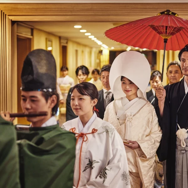荘厳な音色を響かせる雅楽の調べのなか、心地よい緊張感とともに結ばれる家族の絆。洗練された会場へリニューアルされた神殿で永遠の愛を誓う挙式プランです。