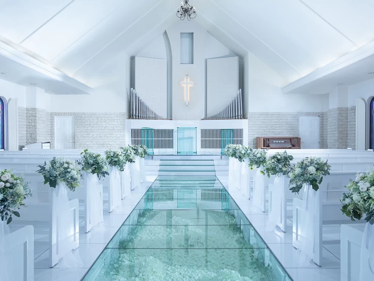| おすすめ ポイント | 清楚な純白チャペル。ガラスのバージンロードの下には贅沢に花びらをぎっしり敷き詰められていて、一目惚れする花嫁様が続出。照明の演出を加えることで幻想的な空間をつくるのもおすすめ。 |